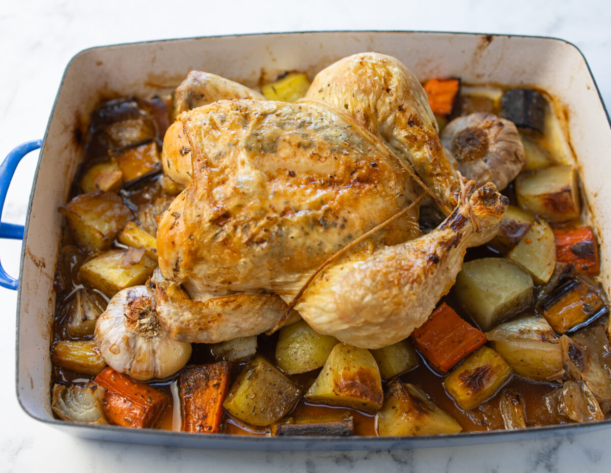You will love – the joy of roasting a whole chicken with the delicious aroma, the crispy, golden-brown skin, and the perfectly juicy, tender meat. Vegetables and Au Jus Gravy a bonus!